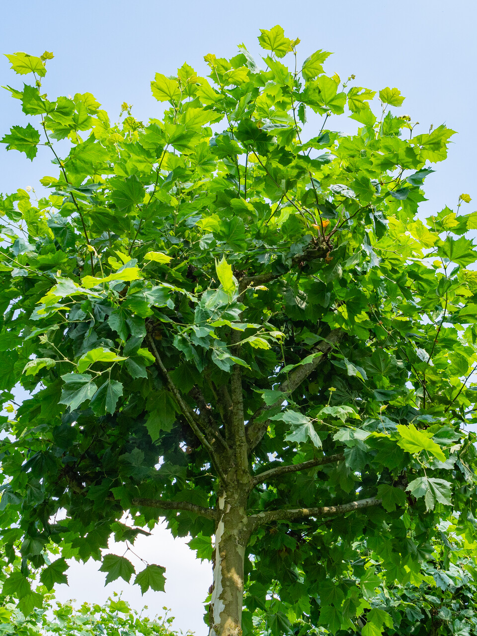 Platanus ×hispanica can eventually reach a height of 20 - 30 (35) m, fast growing, depending on the site and climate conditions.