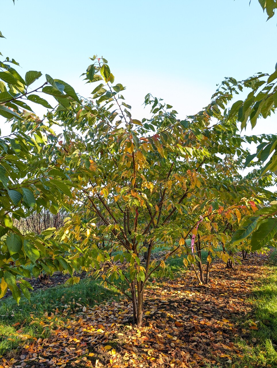 The leaves of Prunus serrulata 'Kanzan' turn yellow, orange in autumn.