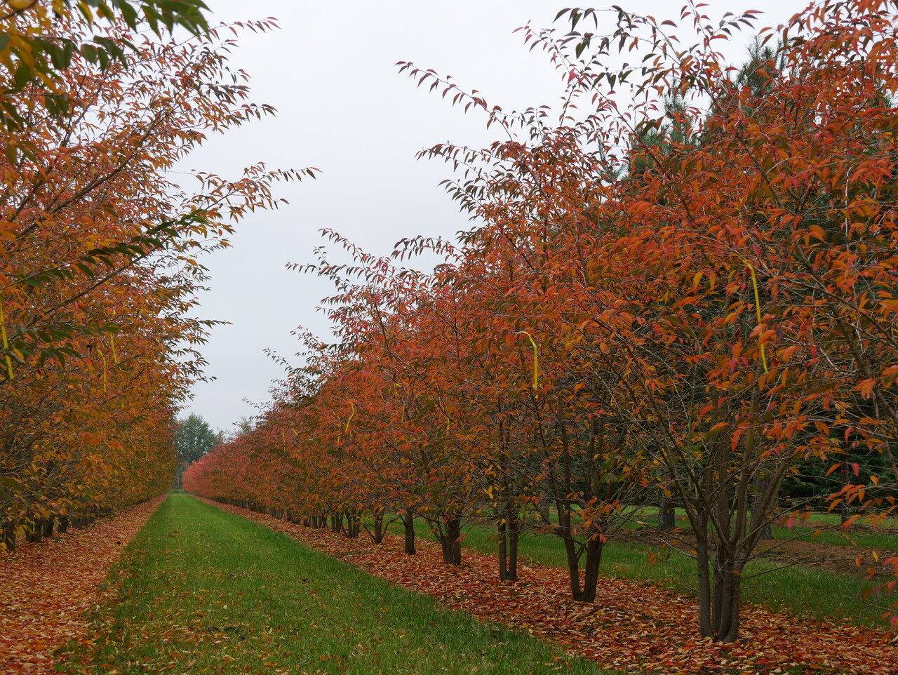 The leaves of Prunus 'The Bride' turn orange, red, purple in autumn.